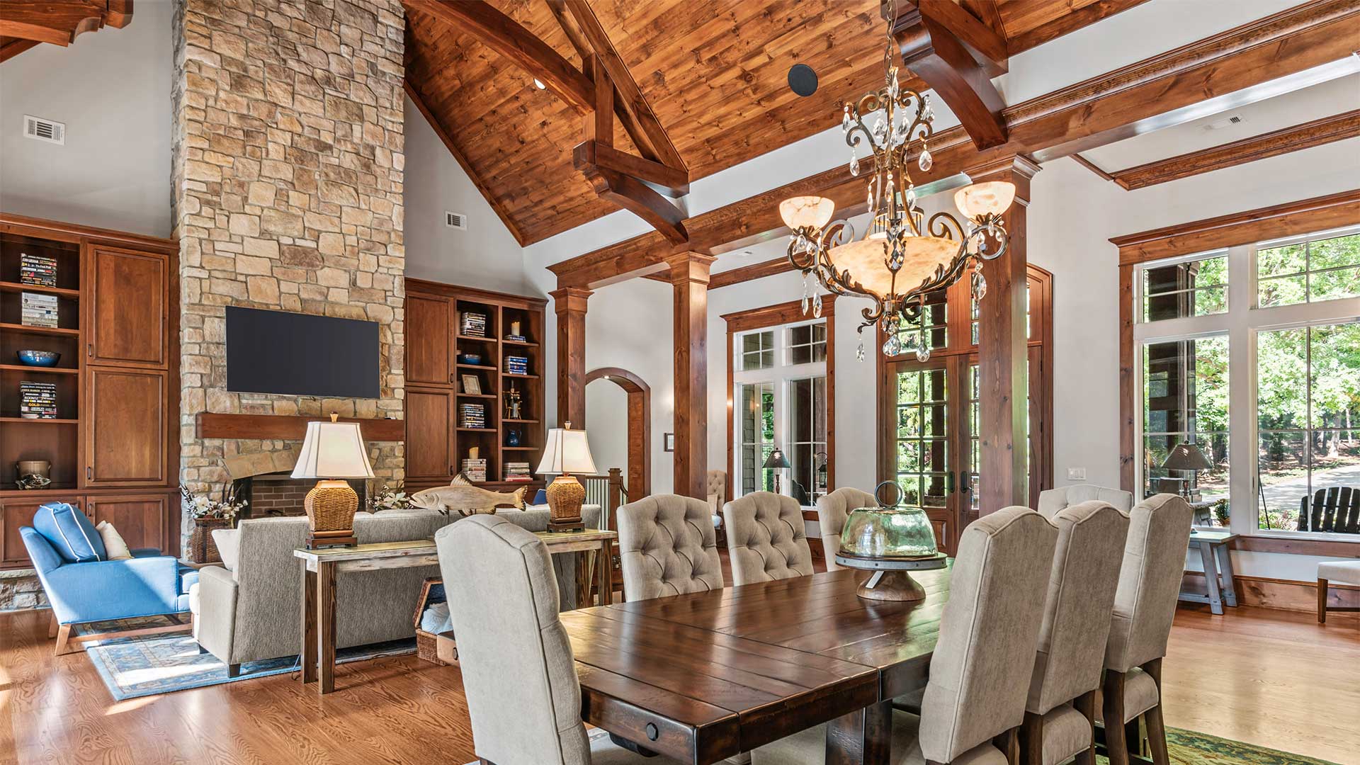 - Indoor living: soaring ceilings, floor-to-ceiling stone fireplace, chef’s kitchen with Wolf & Sub-Zero, adjacent sitting room, wine room, craft room, butler’s pantry, and a large ensuite garage apartment for guests.