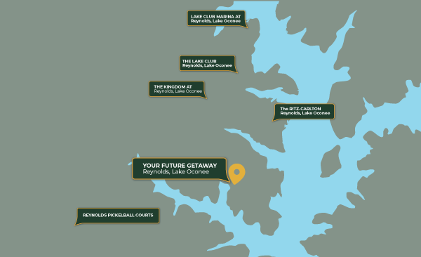 You’re minutes to marinas, clubhouse, tennis & pickleball, playgrounds, pools, and miles of trails; 5 minutes to the Ritz-Carlton Lake Oconee. I’d like to show proximity to main-lake runouts with a simple annotated map pin. I’m going to see how we can get this without an illustrator.